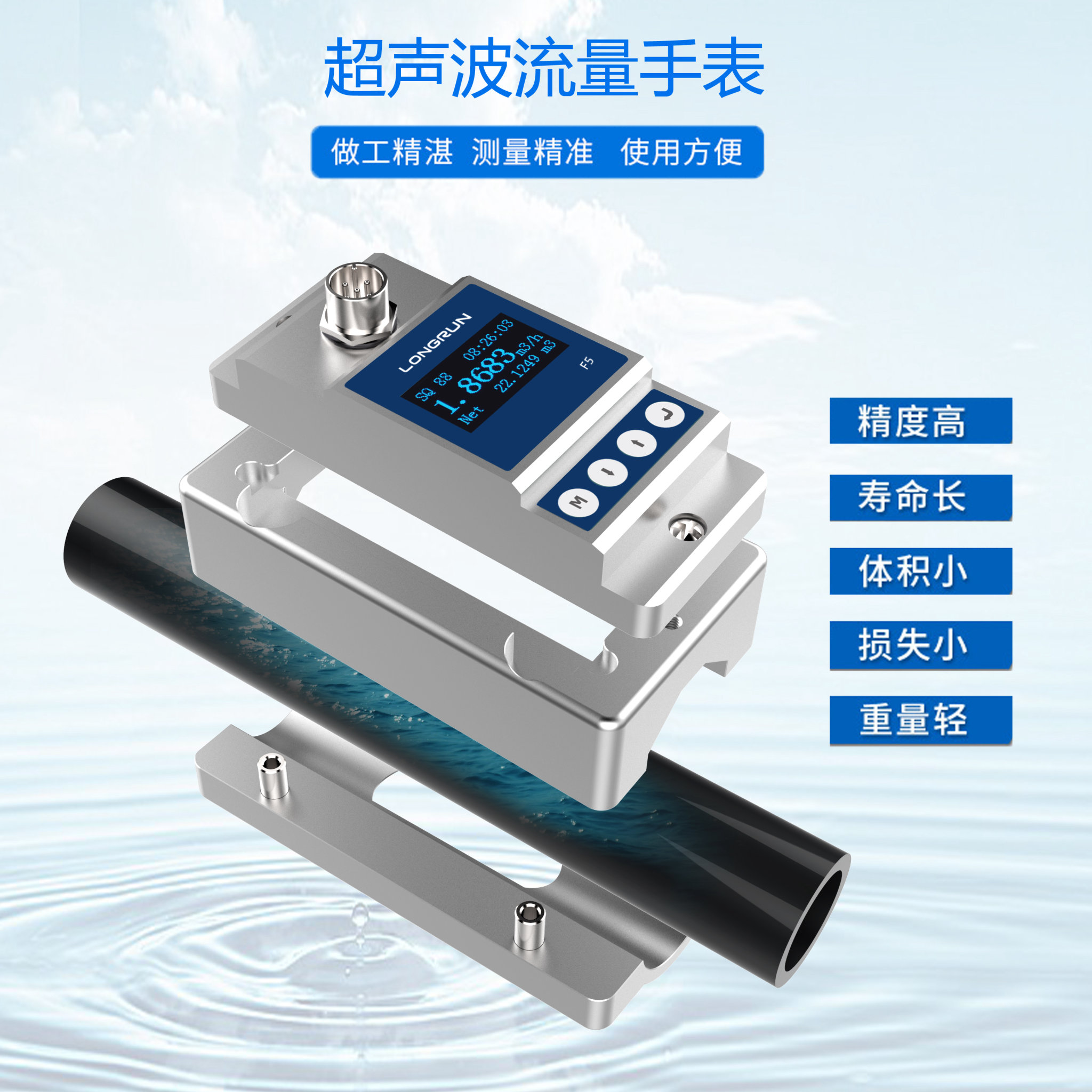 F5超声波流量计,又称流量手表。它凭借在固定小管径管道流体测量的专利创新,而独具优势。 独家全新安装设计-自动磁铁支架扣, 只需2-3分钟即可完成从安装到测量的整个过程;无须额外改动管路,不需要专业知识,根据操作指南就能完成安装和测量;没有可动部件、没有压⼒损失,不需停产即可安装使⽤;OLED显示屏,即使在弱光环境下也易于分辨;适用于多种管道:不锈钢管,碳钢管,铜管,塑料管(PVC,PVDF,PPR,PPH,HDPE等)。