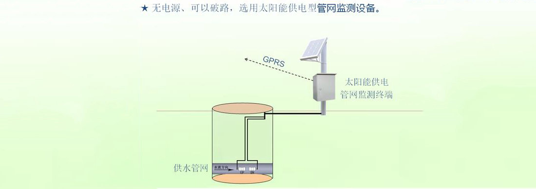 管网监测终端被安装在监测点,采集现场流量计的输出信号,通过GPRS传输到监测中心,可采用太阳能供电监测终端。
